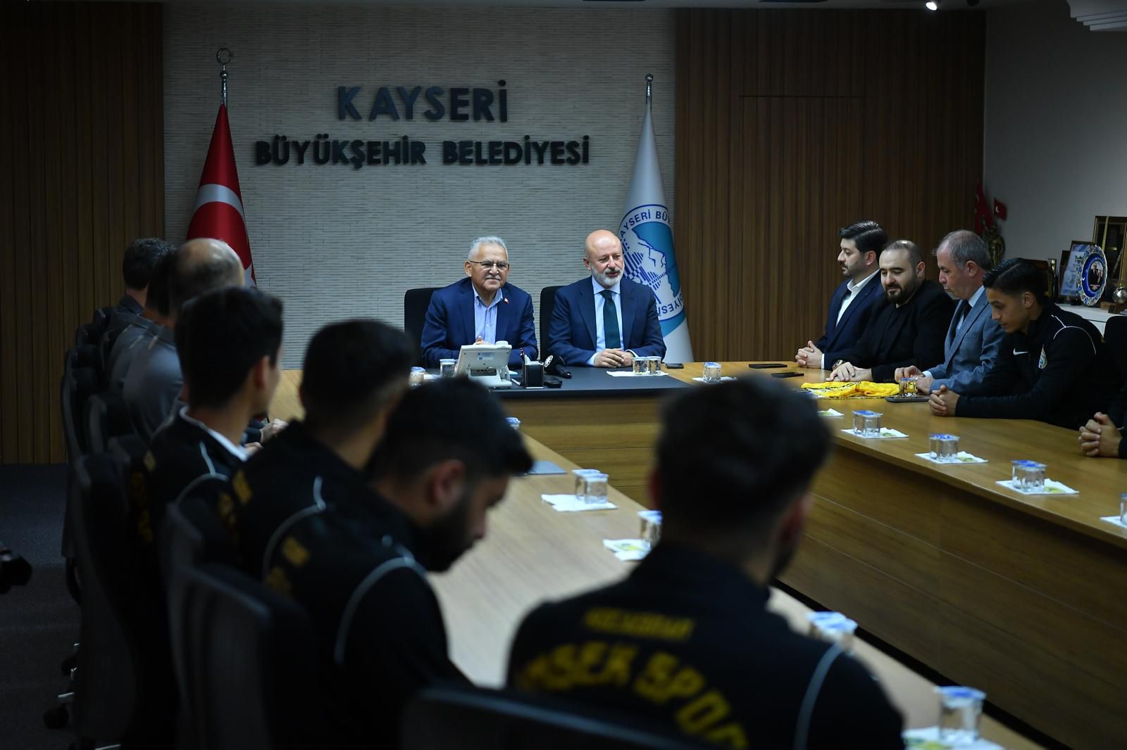 Başkanlık toplantı salonunda gerçekleşen ziyarette konuşan Başkan Büyükkılıç, “Bir bakıma futbolcu fabrikası olarak nitelendirilen Kocasinan Şimşekspor’un Kocasinan Belediyesi’nin ağabeyliğinde yol almasını önemsiyoruz” dedi.