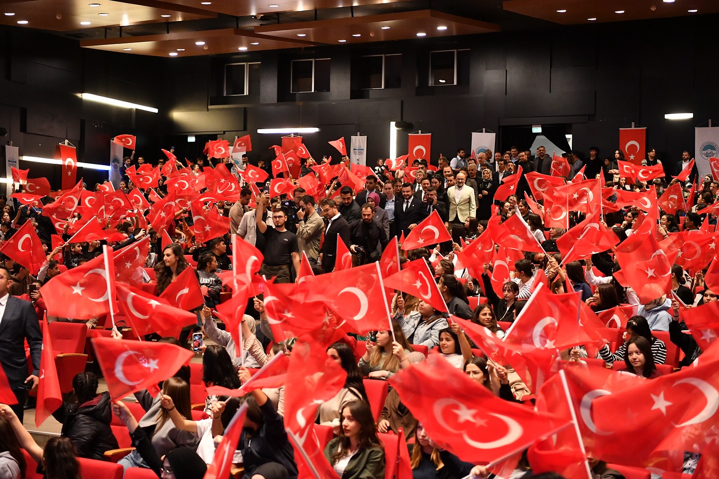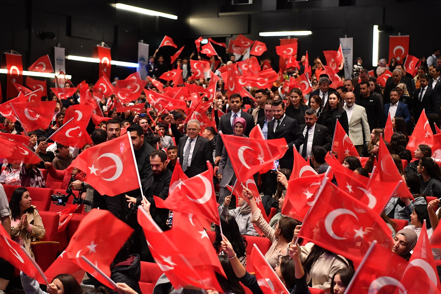 Öğrenciler Kadir Has Kültür ve Sanat Merkezi’nde Başkan Büyükkılıç, Bakan Göktaş ve protokol üyelerini Türk bayrakları ile coşkulu bir şekilde karşıladılar.