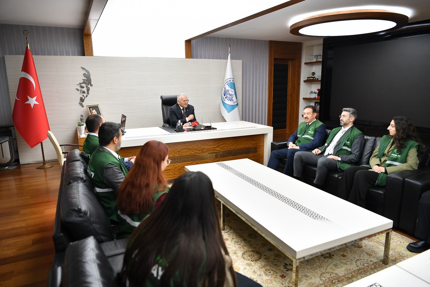 Kayseri Büyükşehir Belediyesi, toplum sağlığını önceleyen çalışmalar kapsamında sivil toplum kuruluşlarıyla güçlü iş birliğini sürdürmeye devam ediyor. Bu kapsamda Başkan Büyükkılıç, Yeşilay Kayseri Şube Başkanlığı görevine seçilen Mustafa Demir ve yönetim kurulu üyelerini makamında ağırladı.