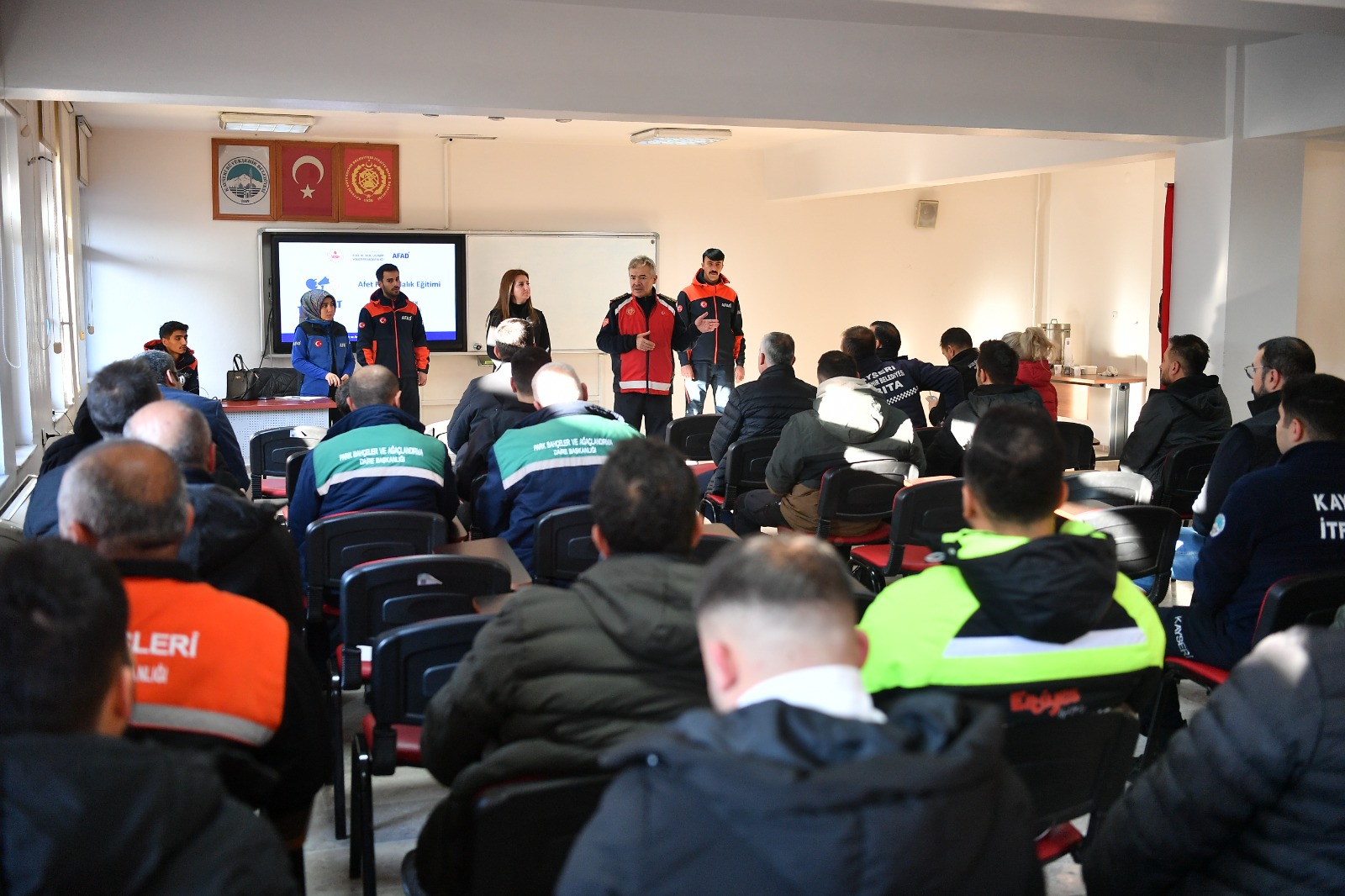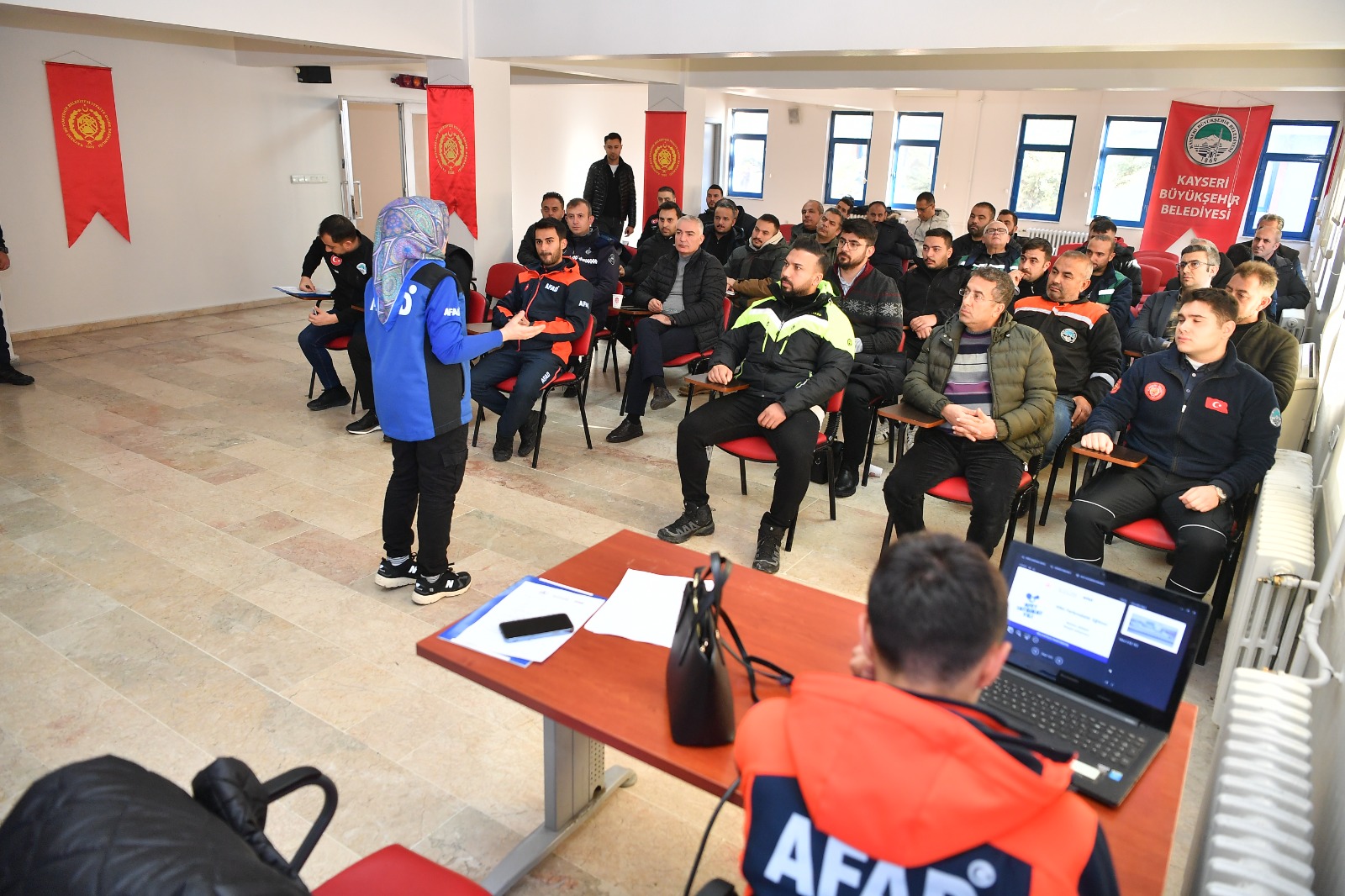 Büyükşehir Belediyesi İtfaiye Daire Başkanı Mustafa Metin Kızılkan ve Afet İşleri ve Risk Yönetimi Daire Başkanı Gonca Arın, büyükşehir personeli ile AFAD Kayseri İl Müdürlüğü görevlilerinin sunum yaparak katıldığı eğitimle Büyükşehir öncülüğünde Kayseri, afetlere hazırlık ve dirençli şehir doğrultusunda önemli bir aşamayı daha kaydetti.