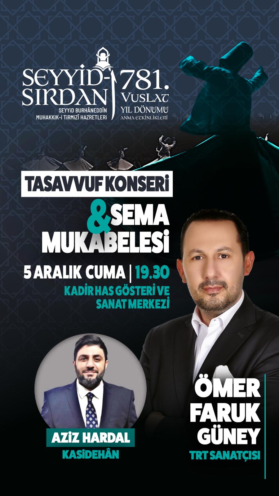 Katılımın ücretsiz olduğu program kapsamında 5 Aralık Cuma günü saat 19.30’da Kadir Has Gösteri ve Sanat Merkezi’nde düzenlenecek Tasavvuf Konseri ve Sema Mukabelesi’nde TRT Sanatçısı Ömer Faruk Güney ve Kasidehan Aziz Hardal Kayserilileri mest edecek.