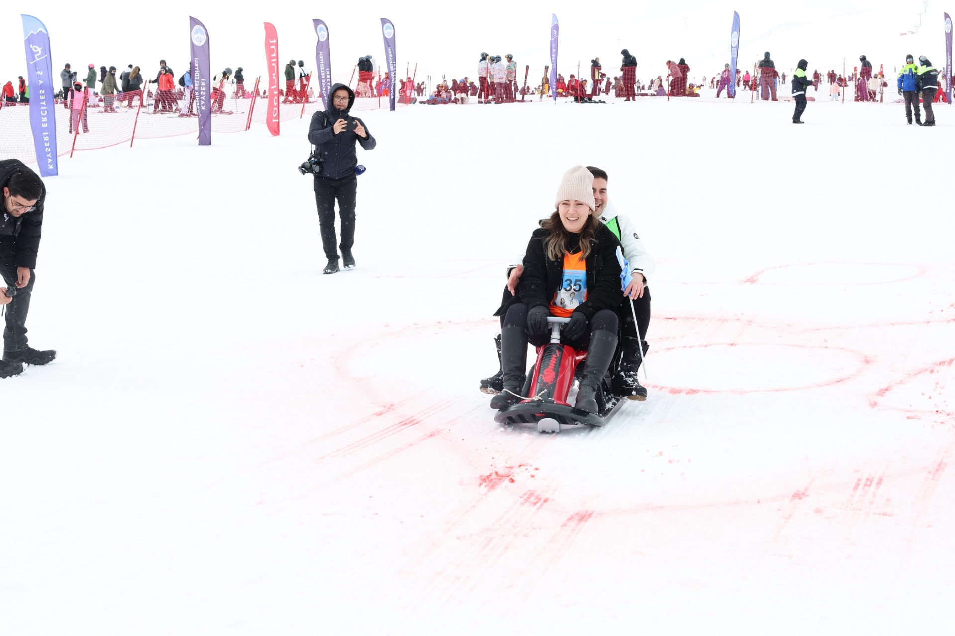 Erciyes Tekir Kapı bölgesinde yapılan yarışmaya farklı şehirlerden 10 çift katıldı. Yarışmada çiftler önce kızakla birbirlerini çekti, ardından hiç ara vermeden birlikte kızakla kayarak bitiş noktasına ulaşmak için mücadele etti. Heyecan, spor ve eğlencenin bir arada yaşandığı organizasyonda çiftler parkuru en kısa sürede tamamlamak için kıyasıya yarıştı.