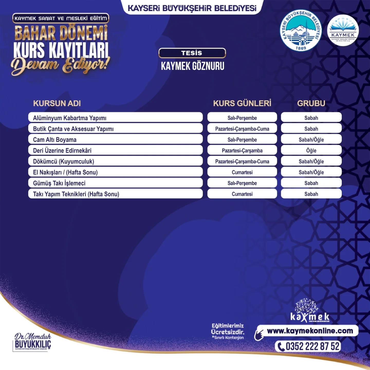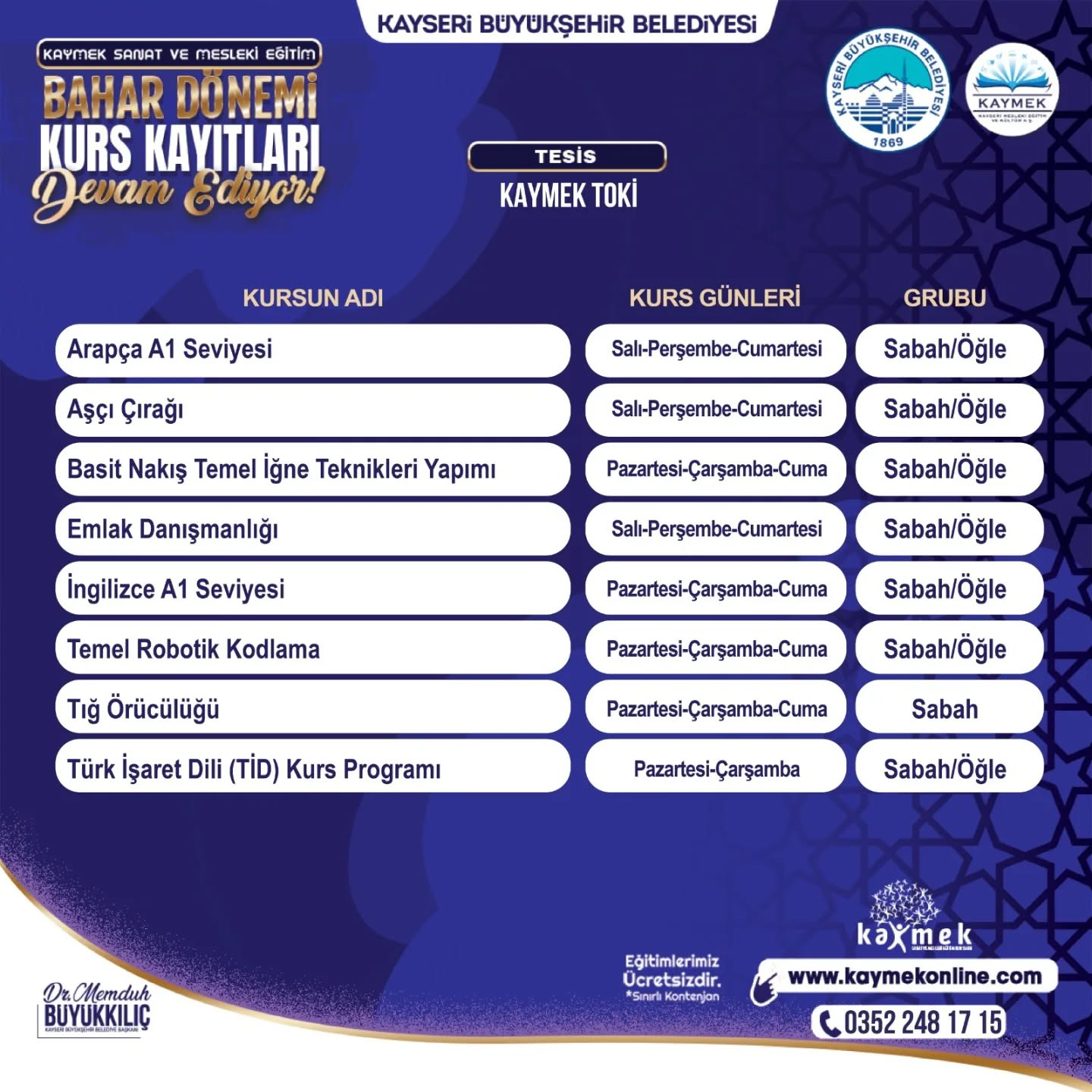 KAYMEK’in alanında uzman eğitmenleri tarafından tamamen ücretsiz olarak verilecek ve kontenjanları sınırları olan kurslar için kayıtlar www.kaymekonline.com internet adresi üzerinden gerçekleştirilebilecek. Kurslar hakkında detaylı bilgiye de bu internet adresi üzerinden ve 0 352 231 80 31 numaralı telefon üzerinden erişebilecek vatandaşlar, 1 Şubat 2026 tarihine kadar kayıt işlemlerini yapabilecek.