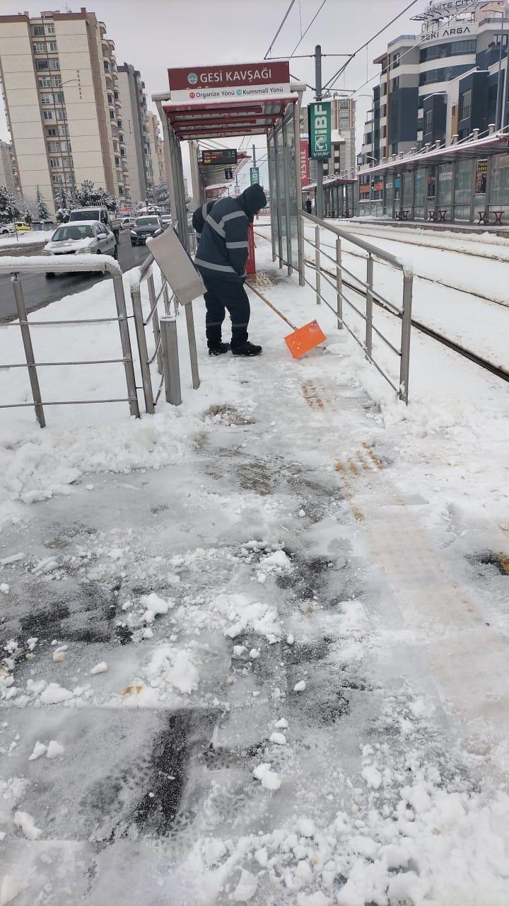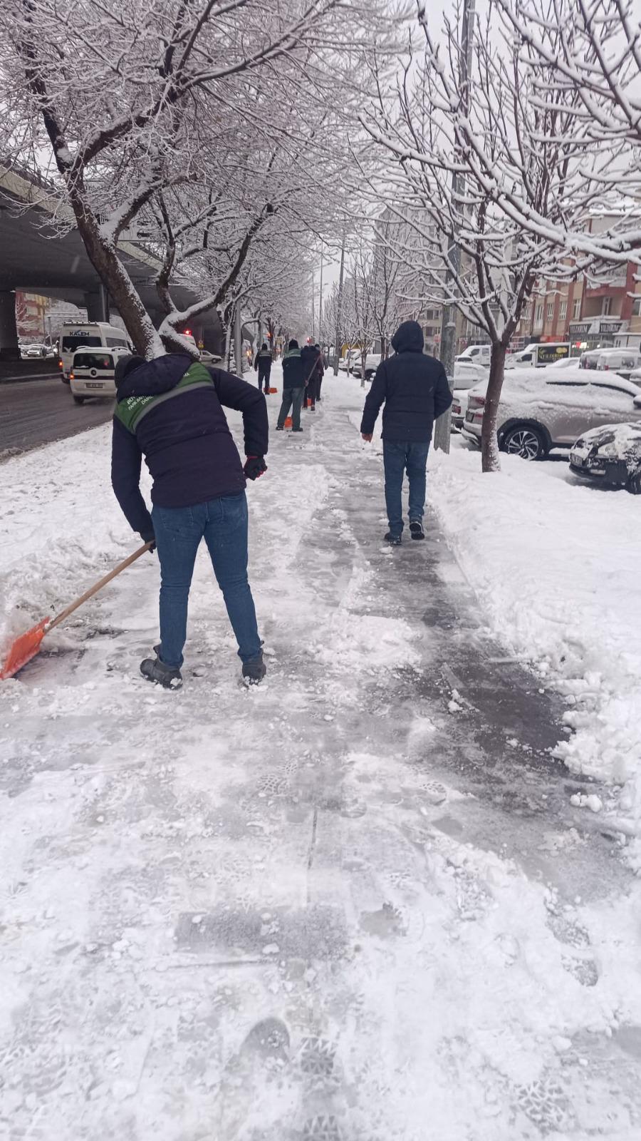 Park ve Bahçeler Daire Başkanlığı ekipleri de 72 personel ile yaya yolları, kaldırımlar, üst geçitler, durak çevreleri ve kamusal alanlarda kar temizliği çalışmalarını titizlikle yürüttü. Özellikle buzlanma riski bulunan bölgelerde tuzlama çalışmaları yapılarak, vatandaşların günlük yaşamlarını güvenli şekilde sürdürebilmeleri hedeflendi.