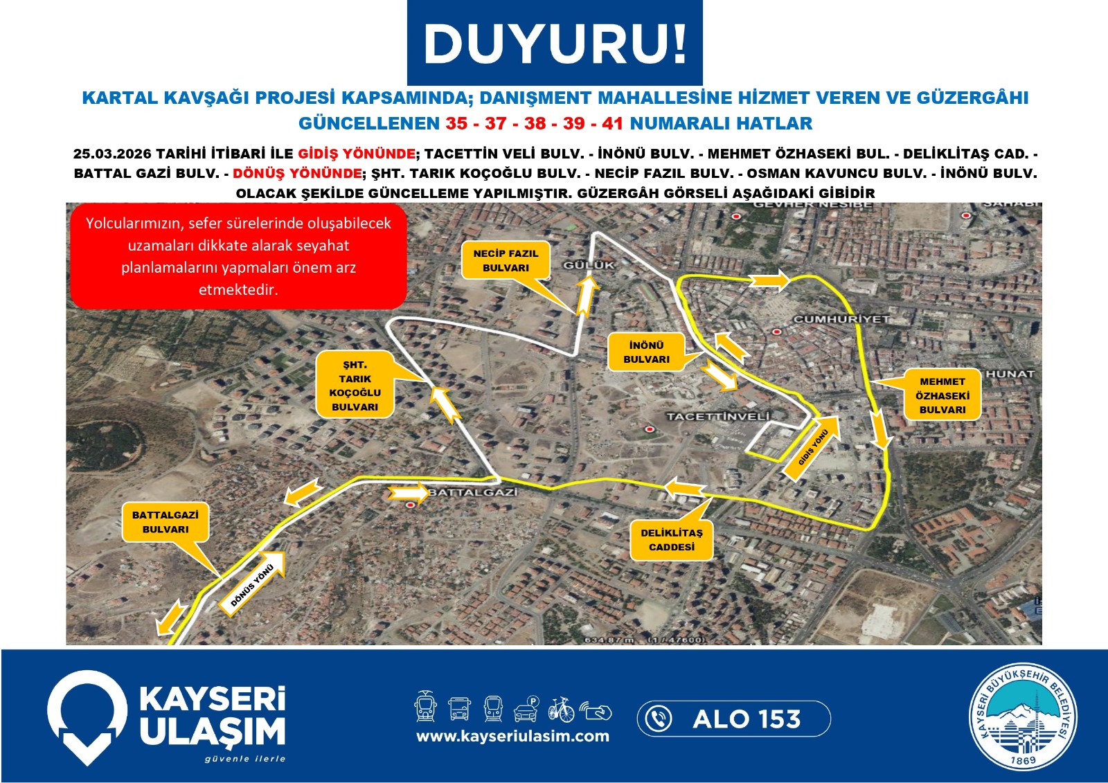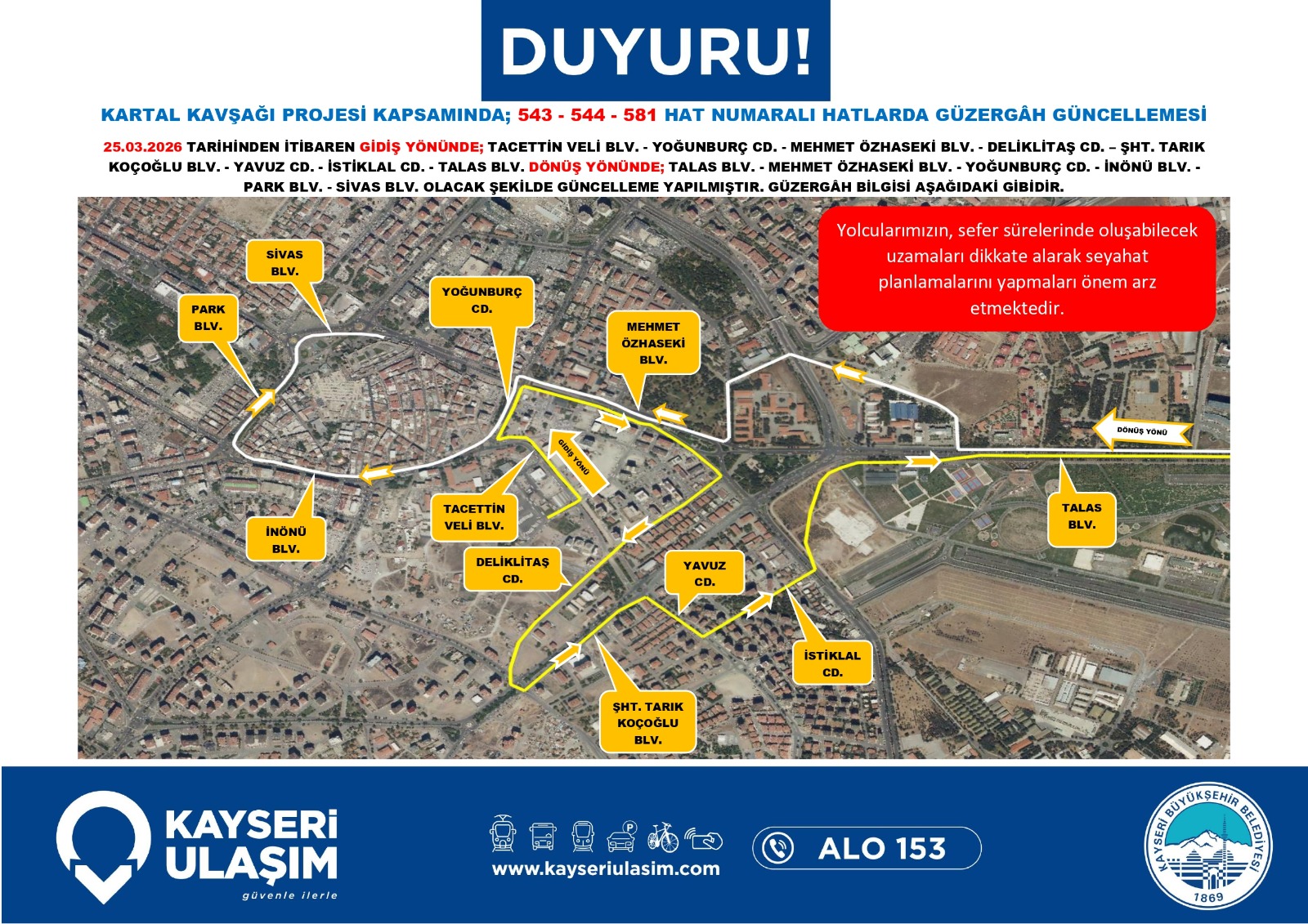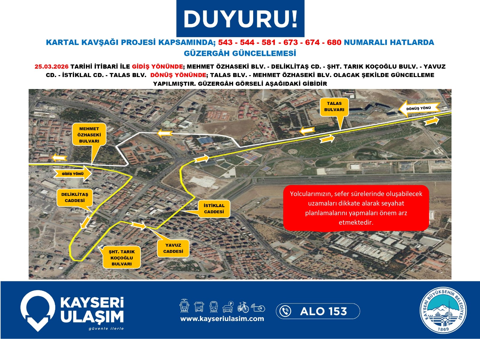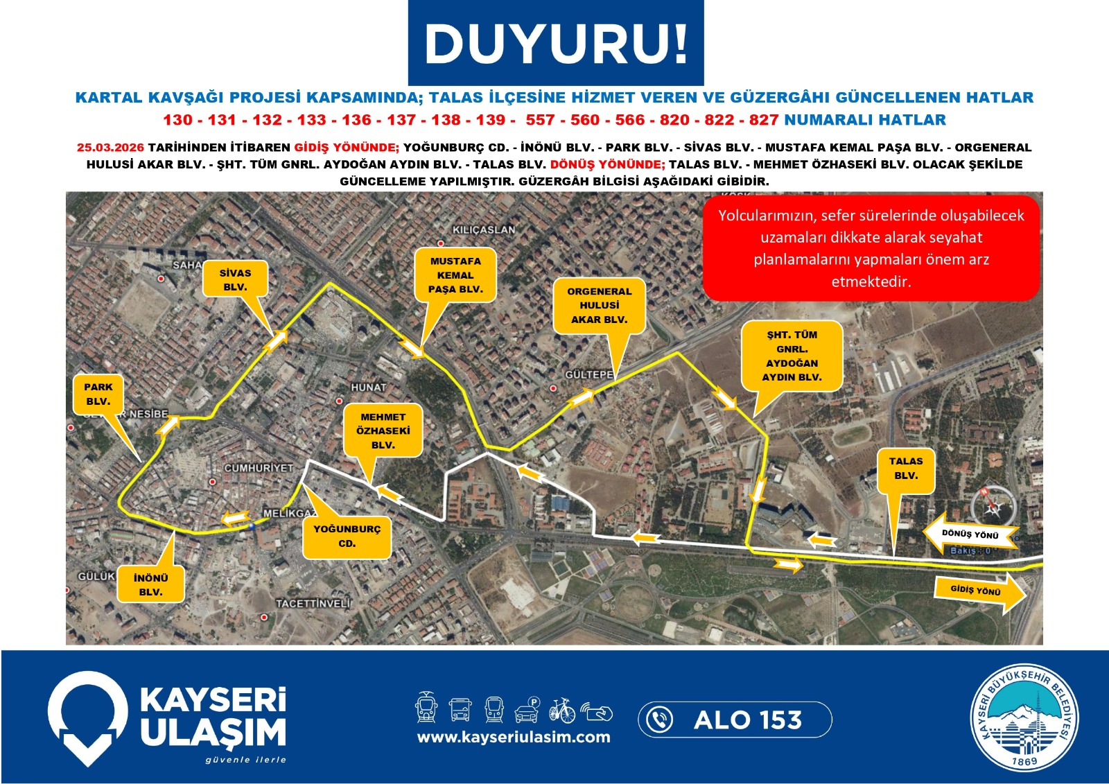 Kayseri Ulaşım A.Ş. tarafından yapılan duyuruda ise Kartal Katlı Kavşağı Projesi kapsamında toplu taşıma araçlarının belirlenen alternatif güzergâhları kullanacağı bildirildi. Bu kapsamda, hatlarda geçici güzergâh değişiklikleri uygulanacak.
