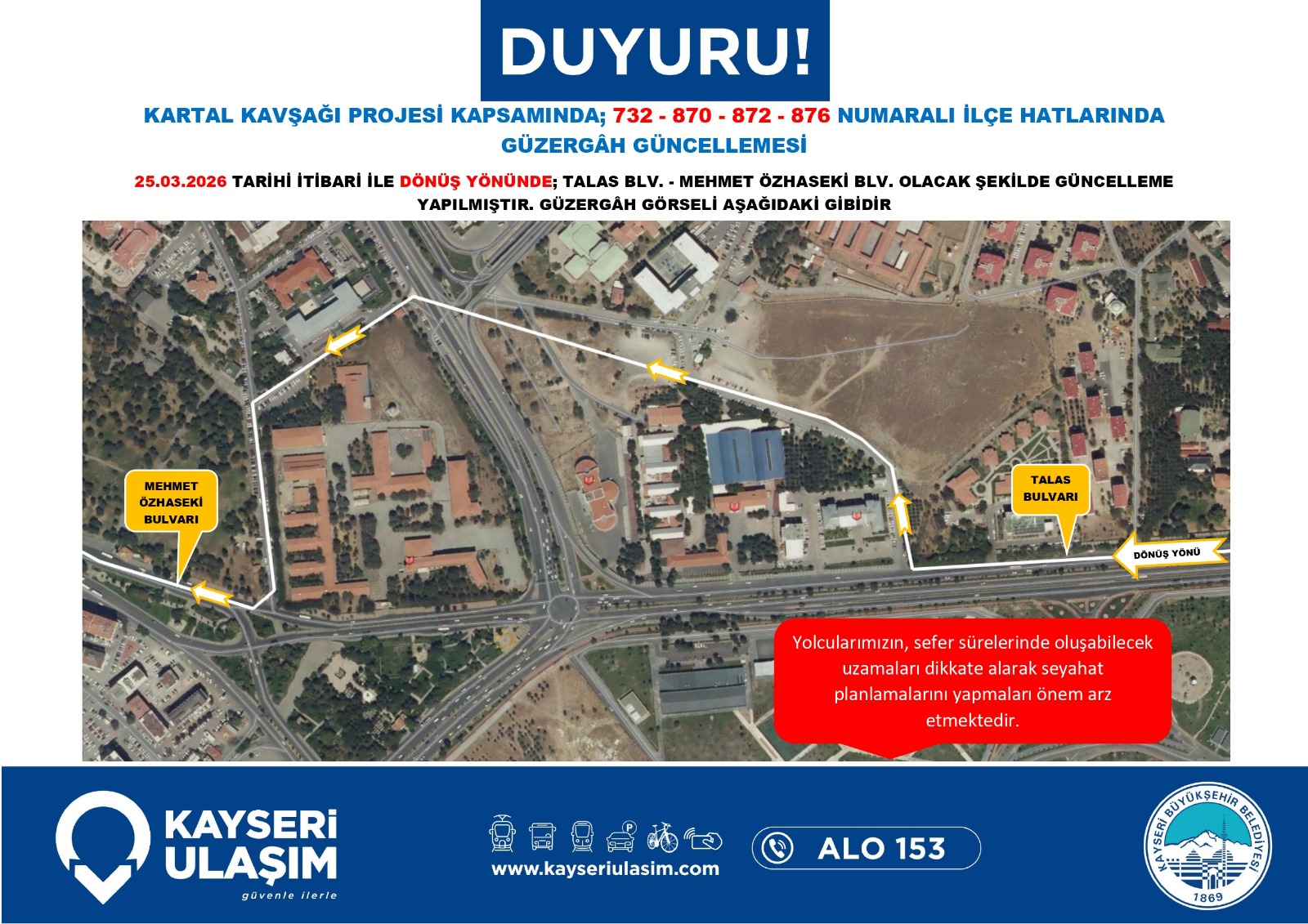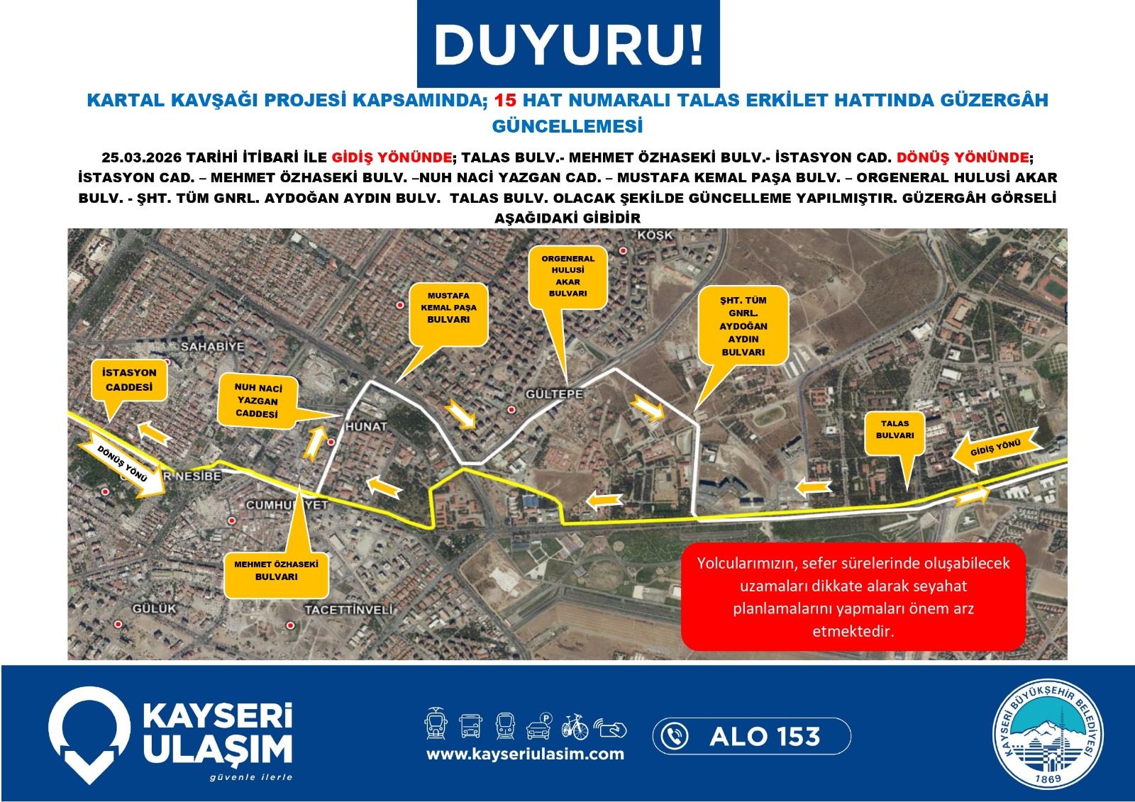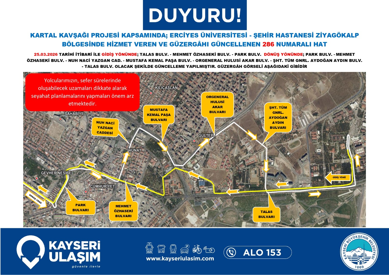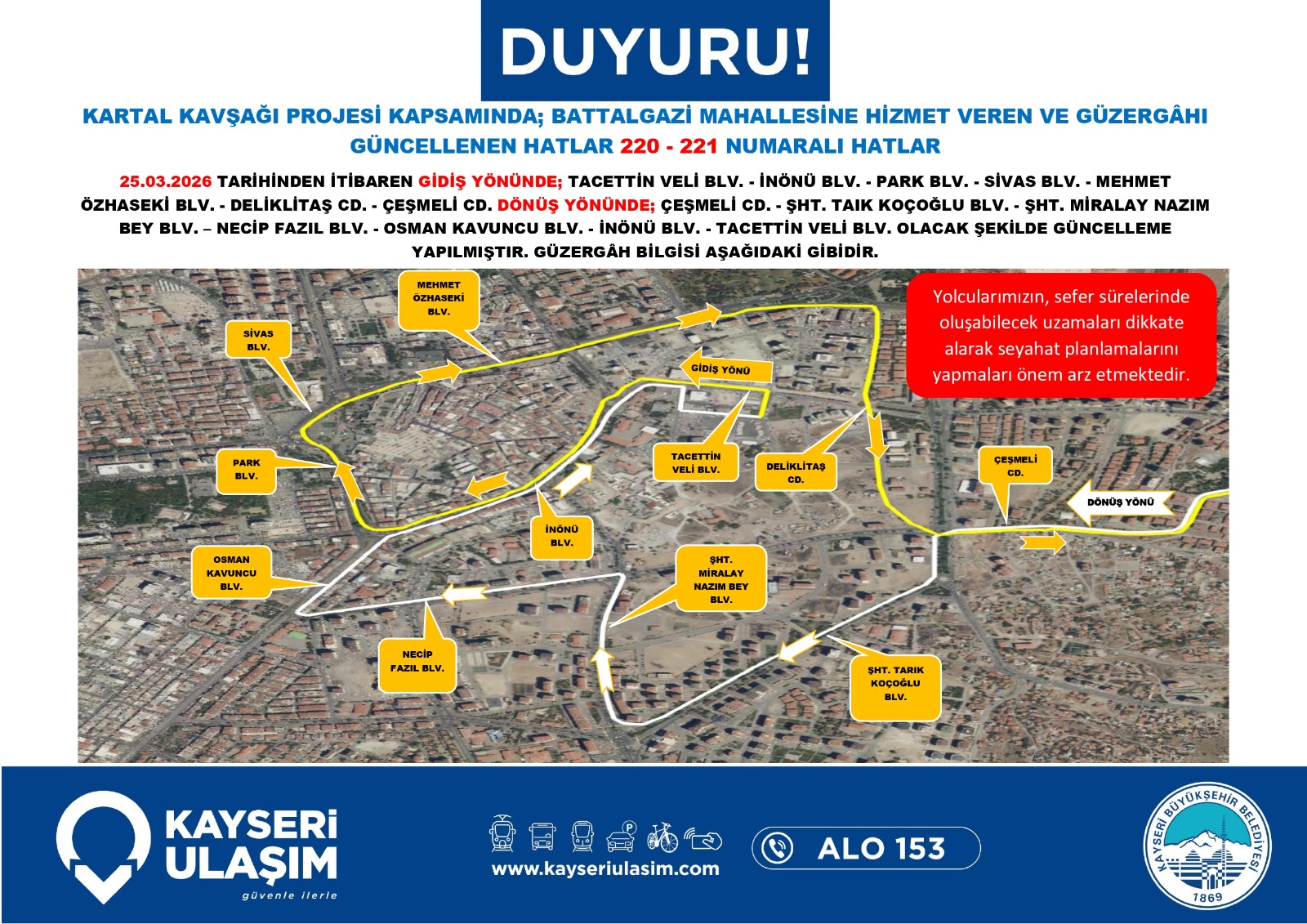 Kayseri Ulaşım A.Ş. tarafından yapılan duyuruda ise Kartal Katlı Kavşağı Projesi kapsamında toplu taşıma araçlarının belirlenen alternatif güzergâhları kullanacağı bildirildi. Bu kapsamda, hatlarda geçici güzergâh değişiklikleri uygulanacak.