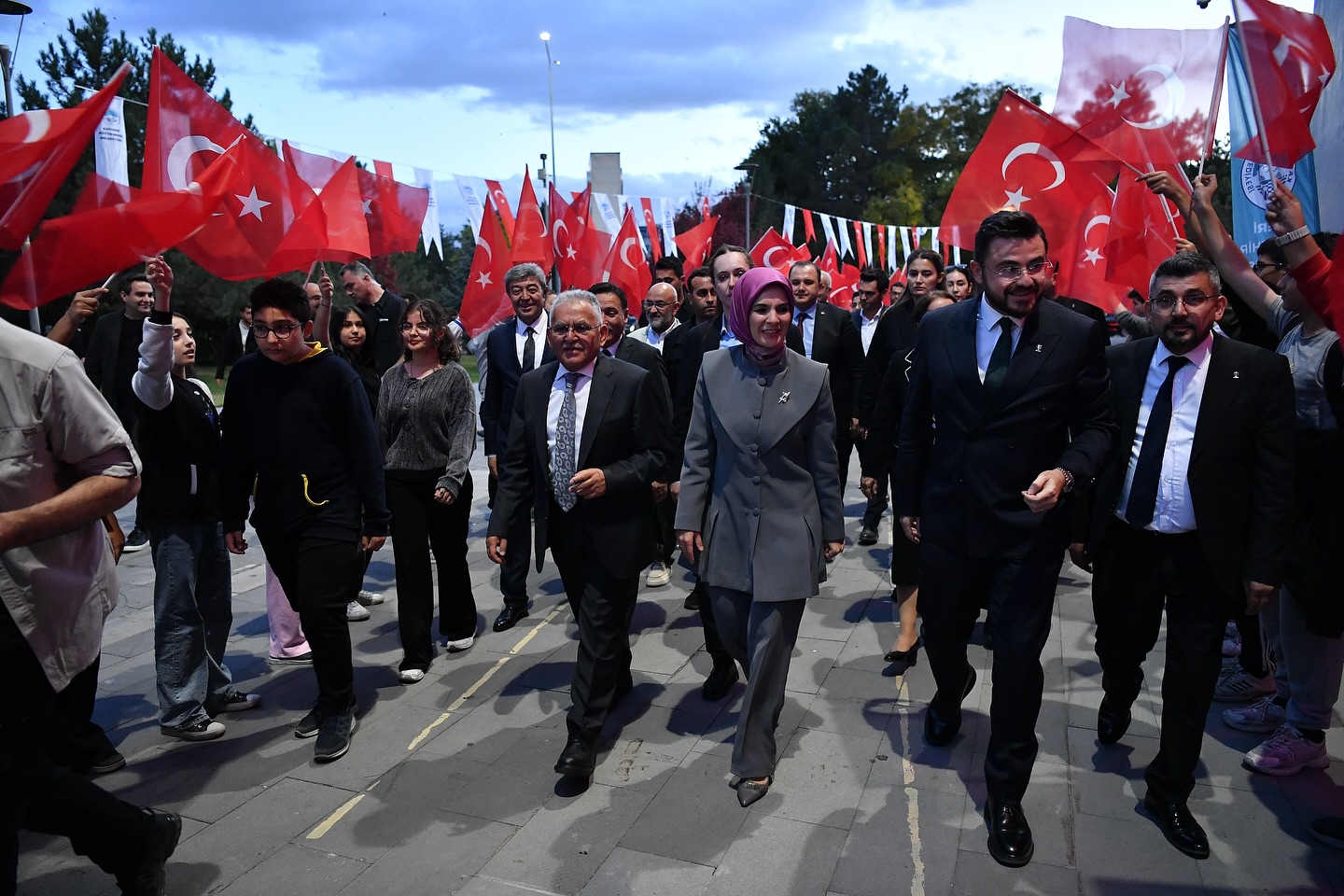 Öğrenciler Kadir Has Kültür ve Sanat Merkezi’nde Başkan Büyükkılıç, Bakan Göktaş ve protokol üyelerini Türk bayrakları ile coşkulu bir şekilde karşıladılar.