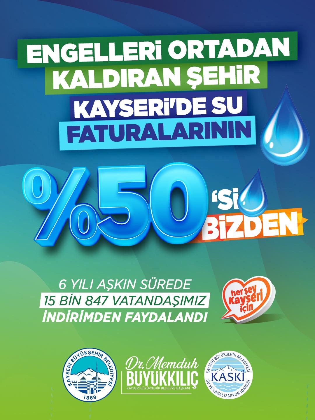 Kayseri Büyükşehir Belediye Başkanı Dr. Memduh Büyükkılıç, 2025 yılı itibarıyla engelli vatandaşlara sağlanan su faturası indirimine devam ediyor. Bugüne kadar toplamda 15 bin 847 engelli vatandaş, su faturalarında yüzde 50 indirim desteğinden faydalandı.
