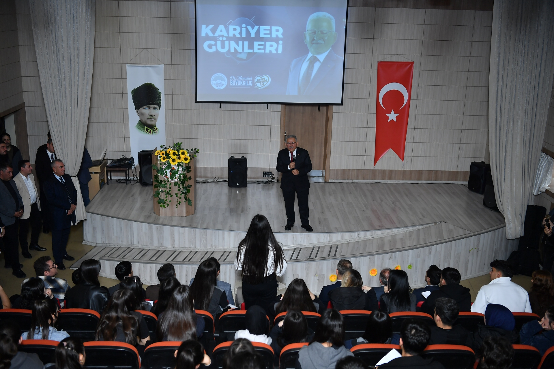 Kayseri Büyükşehir Belediye Başkanı Dr. Memduh Büyükkılıç, Kariyer Günleri programı kapsamında Fevzi Çakmak Anadolu Lisesi’ni ziyaret ederek öğrencilerle bir araya geldi. Başkan Büyükkılıç, gençlerle tecrübelerini paylaşarak eğitimden kariyer planlamasına, şehir vizyonundan gençlere yönelik projelere kadar birçok konuda önemli mesajlar verdi.