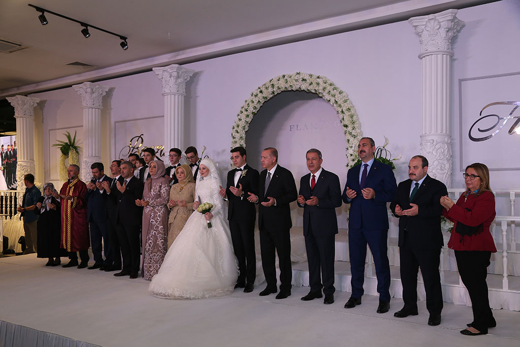 Büyükşehir Belediye Başkanı Mustafa Çelik ve eşi İkbal Çelik, oğulları Furkan Çelik’i evlendirmenin mutluluğunu yaşadı. Çelik ailesinin bu mutlu günlerine Cumhurbaşkanımız Recep Tayyip Erdoğan da katıldı. Furkan ve Beyza çiftinin nikah şahitliğini yapan Cumhurbaşkanı Erdoğan “İki dünya saadeti diliyorum” ifadeleriyle mutluluklar temennisinde bulundu. Büyükşehir Belediye Başkanı Mustafa Çelik ve eşi İkbal Çelik, dünürleri Nimet ve Mahmut Selçuki ile birlikte tüm misafirleri kapıda karşıladılar. Flamingo De Luxe’de yapılan düğün törenine siyaset, bürokrasi, iş, spor ve sanat dünyasından kalabalık bir davetli topluluğu katıldı. Düğüne iştirak eden Cumhurbaşkanımız Recep Tayyip Erdoğan’ı Büyükşehir Belediye Başkanı Çelik, eşi ve dünürleri ile birlikte düğün salonu girişinde karşıladı. Cumhurbaşkanımızın yerini almasıyla birlikte Kuran-ı Kerim okundu ve dualar edildi. Duaların ardından Beyza ve Furkan çifti sahneye çıktı. Çiftin nikahını İl Müftüsü Doç. Dr. Şahin Güven kıydı. Çiftin şahitliklerini Cumhurbaşkanımız Recep Tayyip Erdoğan ile birlikte Milli Savunma Bakanı Hulusi Akar, Adalet Bakanı Abdülhamit Gül, Sanayi ve Teknoloji Bakanı Mustafa Varank ile Ticaret Bakanı Ruhsar Pekcan yaptı. “GÜÇLÜ AİLELER GÜÇLÜ MİLLETLERİ OLUŞTURUR” İl Müftüsü Güven, gençlerden “Evet” cevabını aldıktan sonra şahitlerin onayını istedi. Cumhurbaşkanımız Erdoğan “Şahit oldum, iki dünya saadeti diliyorum” cevabını verdi. Cumhurbaşkanımız Erdoğan nikah töreninde yaptığı konuşmada gençlere mutluluklar dileyerek, “Evlilik uzun bir yolculuk. Benim bir nasihatim var, bunu biliyorsunuz ama şahitlerin huzurunda tekrar ediyorum. Bir olur garip olur, iki olur rakip olur, üç olur denge olur, dört olur bereket olur, gerisi Allah Kerim. Zira milletler ailelerden oluşur. Güçlü aileler güçlü milletleri oluşturur. İki şuurlu gencimiz var. İnşallah bu aile yuvasını geliştirecekler. Rabbim yar ve yardımcınız olsun” dedi ve aile cüzdanını geline verdi. Aile fotoğrafı çekilirken dualar edildi. Başkan Çelik, dua sırasında torununu kucağına aldı. Cumhurbaşkanımız Erdoğan Başkan Çelik’in torunu ile bir süre yakından ilgilendi.