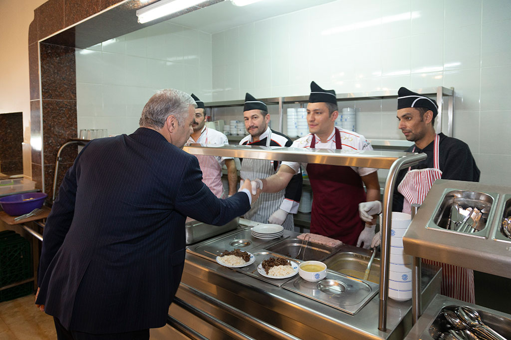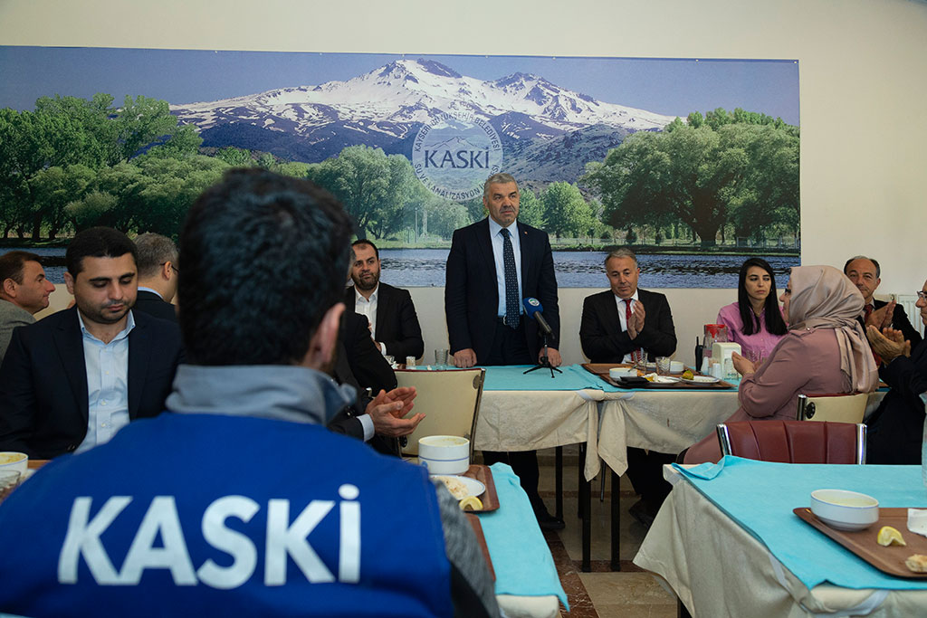 Kayseri Büyükşehir Belediye Başkanı Mustafa Çelik, belediye bünyesindeki birimlere veda ziyaretleri yapıyor. Bu kapsamda ilk ziyaretini KASKİ Genel Müdürlüğü’ne yapan Başkan Çelik, KASKİ personeliyle öğle yemeği yedi ve tüm çalışanlara gösterdikleri gayret nedeniyle teşekkür etti. Büyükşehir Belediye Başkanı Mustafa Çelik, KASKİ Genel Müdürü Ender Batukan tarafından karşılandı. Öğle yemeğini KASKİ yemekhanesinde yiyen Başkan Çelik, tabldotta sıraya girdi ve yemeğini kendisi aldı. Çalışanlarla birlikte yemeğini yiyen Başkan Çelik, KASKİ’nin çalışmalarından övgüyle bahsederek, “Türkiye’de örnek gösterilen bir kurum haline geldik” dedi. 4 yılda ilerde duayla anılacak işler yaptıklarını ifade eden Başkan Çelik, “Bu hizmetleri hep birlikte yaptık. Bundan sonra da bu vatana hizmet etmek için herkes kendi işini en iyi şekilde yapmak için gayret edecek. Görev süremiz içinde mesai kavramı gözetmeksizin gösterdiğiniz gayretli çalışmalar için teşekkür ediyorum. Ağabey-kardeş anlayışıyla çalıştık. İnşallah hiç kimsenin kalbini kırmamışızdır. Haklarınız helal edin” dedi.