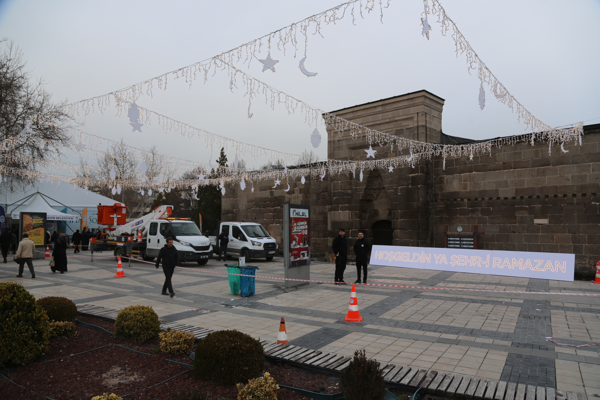 Büyükşehir Belediyesi İşletme ve İştirakler Daire Başkanlığı bünyesinde faaliyet gösteren Teknik Bakım Onarım Şube Müdürlüğü ekipleri tarafından yürütülen çalışmada, cami önündeki meydan “Hoş Geldin Ya Şehr-i Ramazan” yazılı hilal ve yıldız motifleriyle aydınlatıldı.