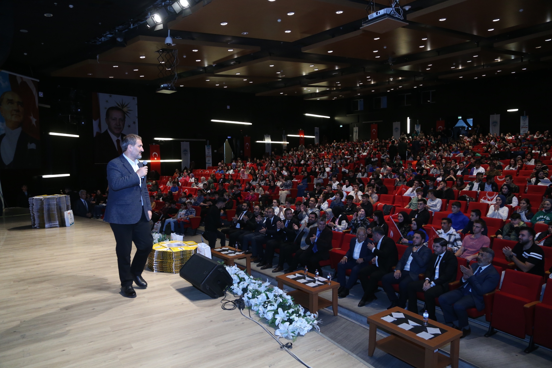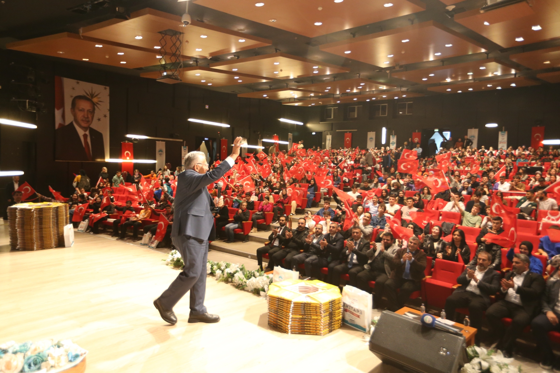 Gençler, ellerindeki Türk Bayrakları ile kırmızı beyaz görsel şölen oluştururken, program kapsamında, sembolik olarak 10 öğrenciye YKS ve LGS kaynak kitaplarının dağıtımı töreni gerçekleştirildi.