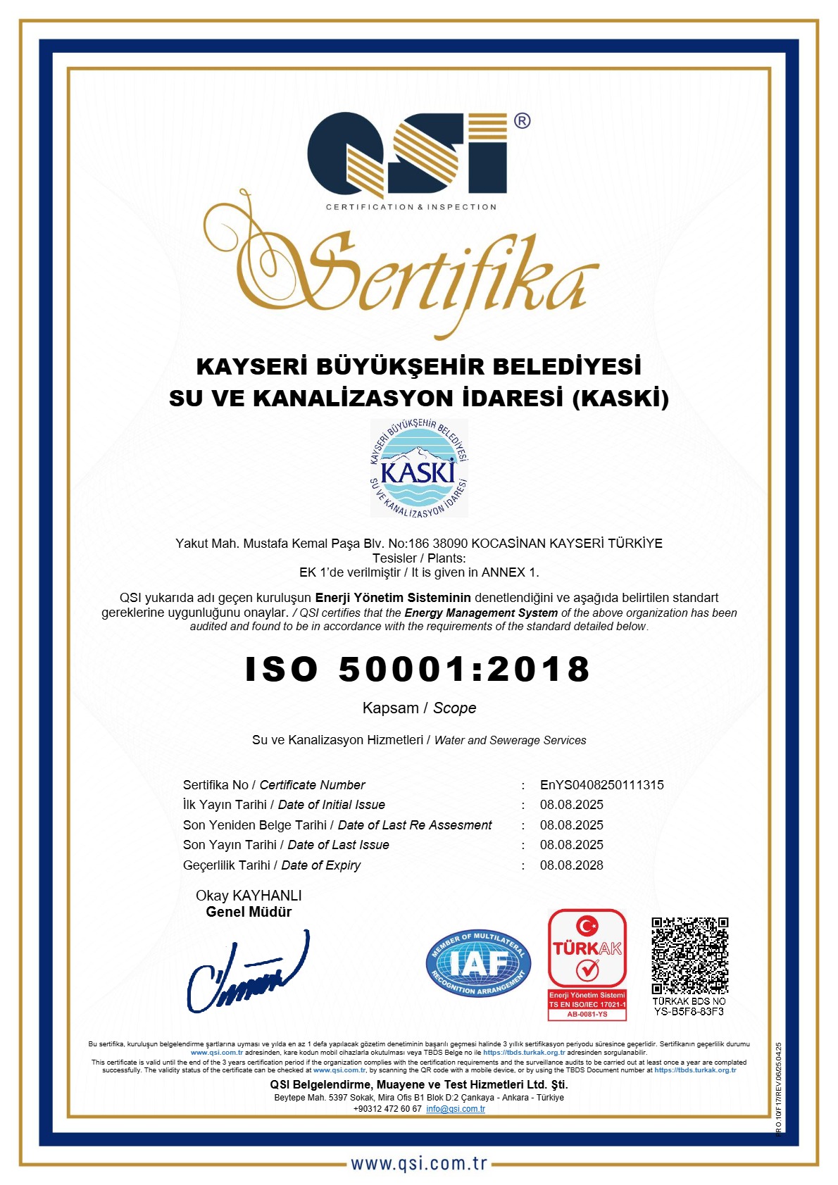 KASKİ, enerji verimliliğini arttırmaya yönelik çalışmaları sayesinde ISO 50001:2018 ‘Enerji Yönetim Sistemi Sertifikası’ almaya hak kazandı. KASKİ aldığı bu sertifika sayesinde enerji kaynaklarının daha bilinçli kullanıldığını, israfın önüne geçildiğini ve çevre dostu uygulamaların benimsendiğini göstermiş oldu.