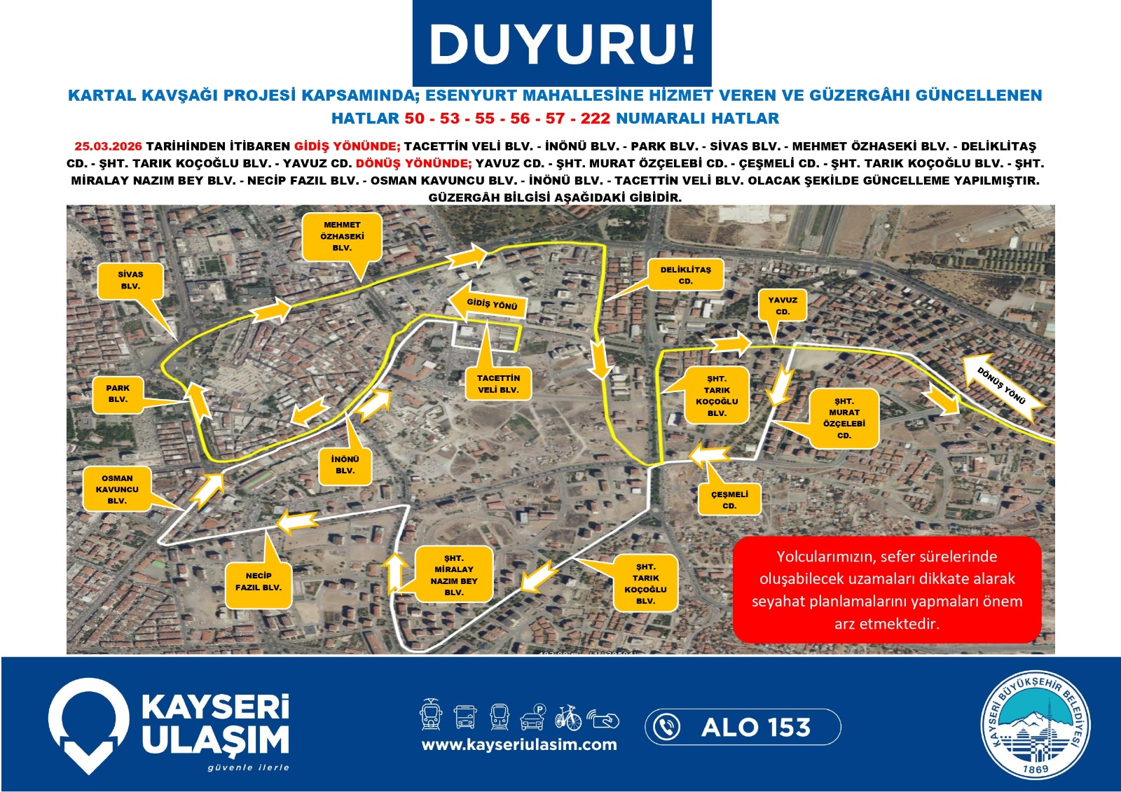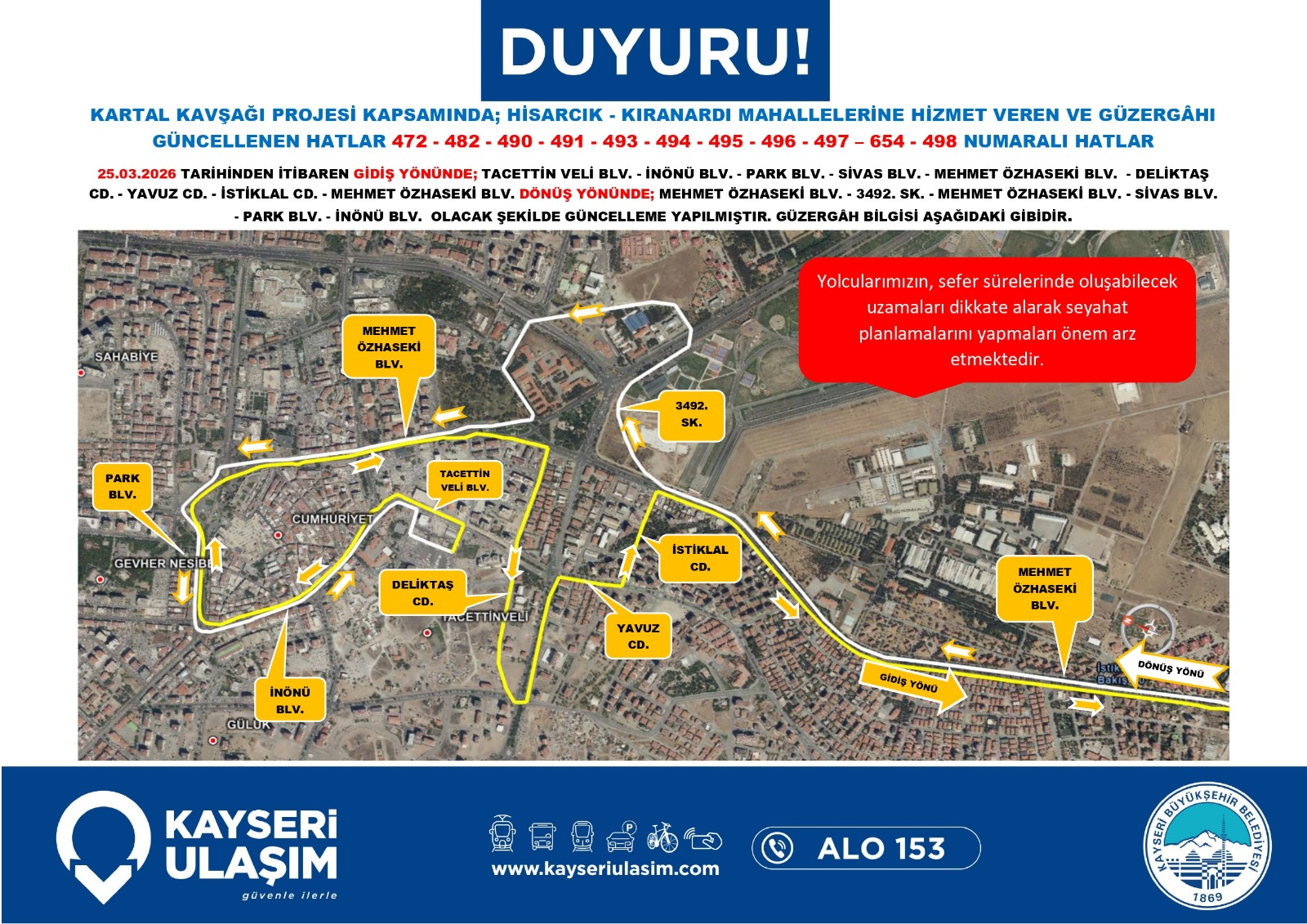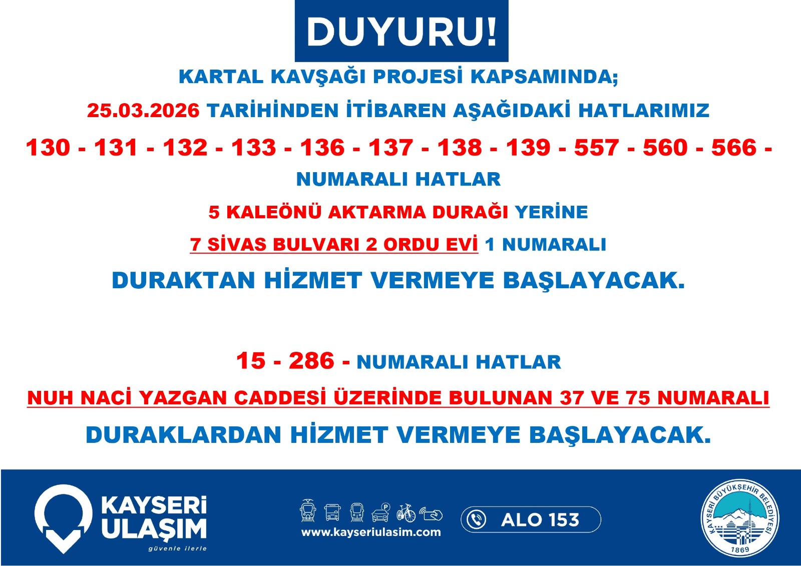 Kayseri Ulaşım A.Ş. tarafından yapılan duyuruda ise Kartal Katlı Kavşağı Projesi kapsamında toplu taşıma araçlarının belirlenen alternatif güzergâhları kullanacağı bildirildi. Bu kapsamda, hatlarda geçici güzergâh değişiklikleri uygulanacak.
