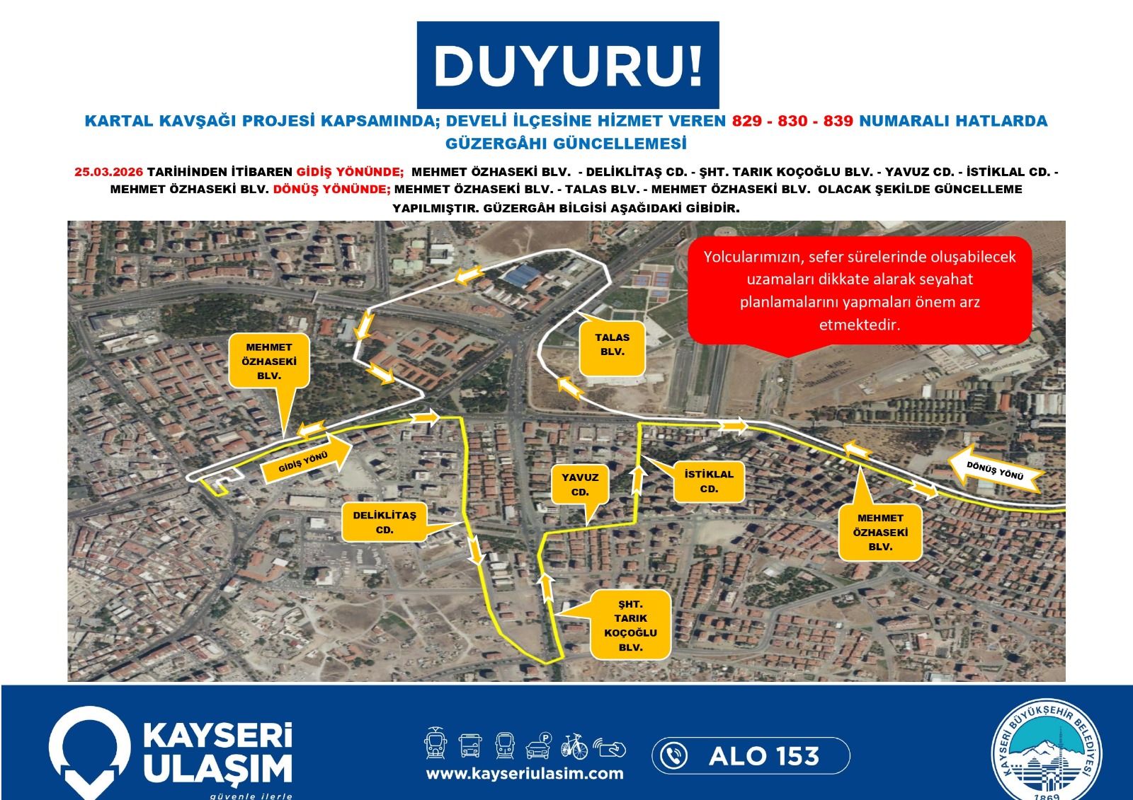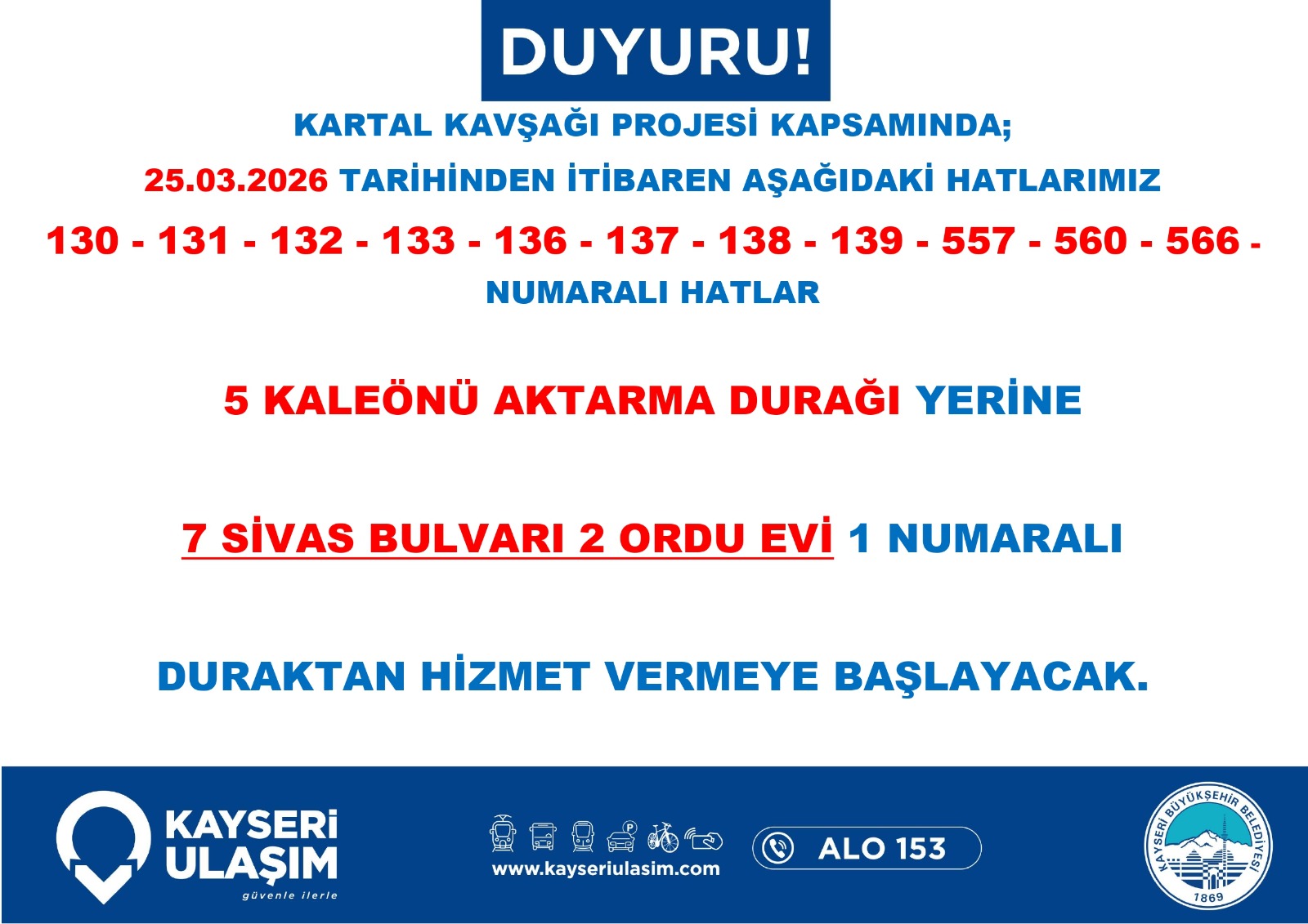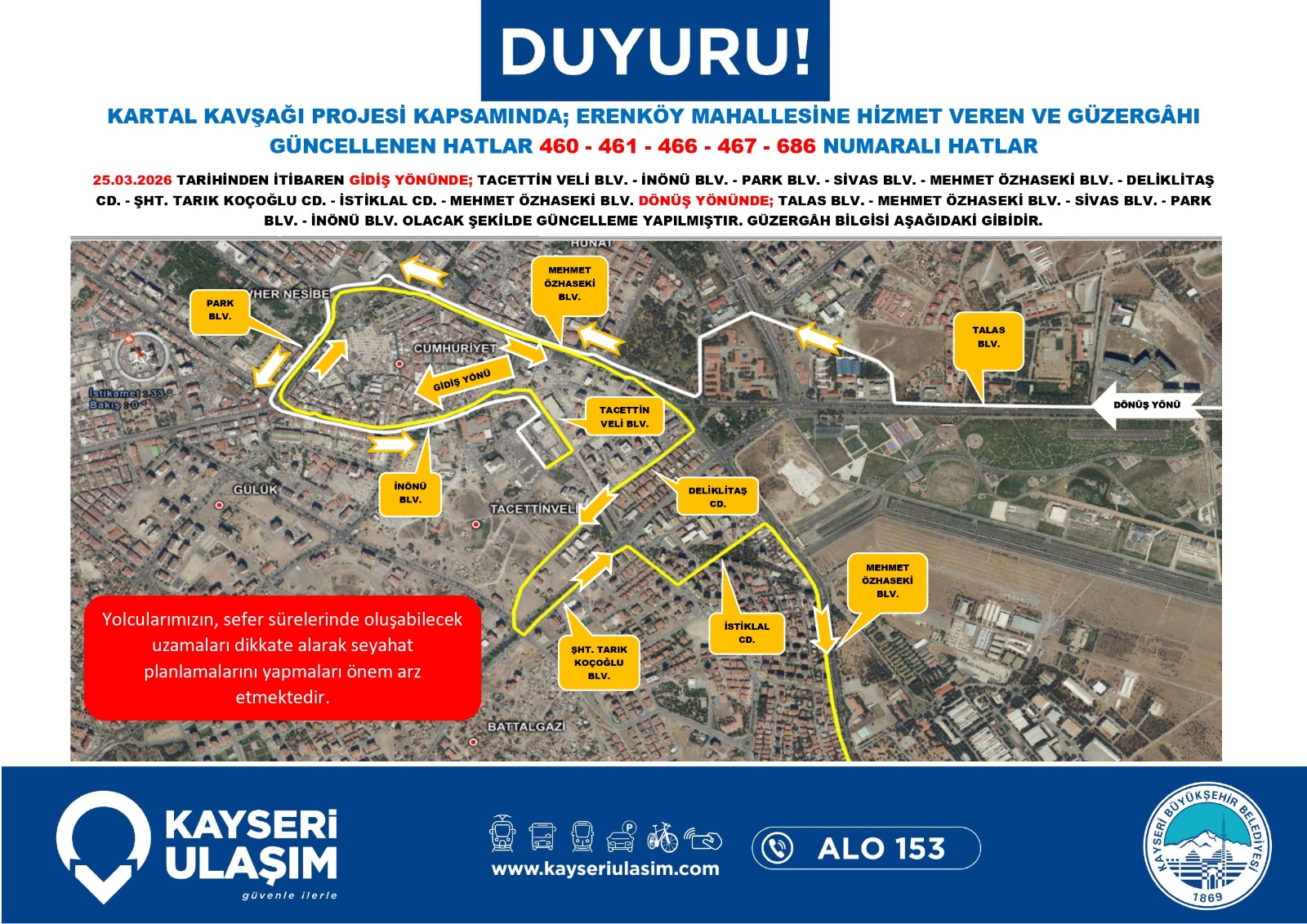 Kayseri Ulaşım A.Ş. tarafından yapılan duyuruda ise Kartal Katlı Kavşağı Projesi kapsamında toplu taşıma araçlarının belirlenen alternatif güzergâhları kullanacağı bildirildi. Bu kapsamda, hatlarda geçici güzergâh değişiklikleri uygulanacak.