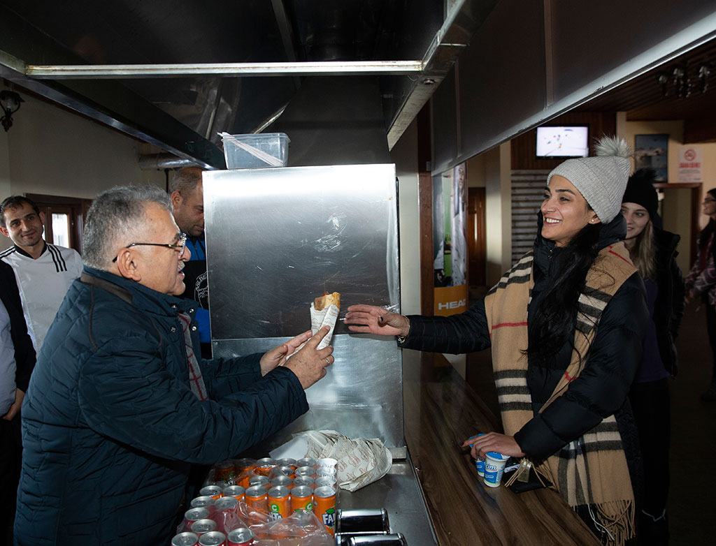 Kayseri Büyükşehir Belediyesi’nin yatırımlarıyla dünyanın sayılı kış turizm merkezlerinden birisi haline gelen Erciyes; açık pistleri, mükemmel hizmeti ve harika lezzetleriyle yerli ve yabancı ziyaretçilerini ağırlamaya devam ediyor. Büyükşehir Belediye Başkanı Dr. Memduh Büyükkılıç, Erciyes’e çıkarak Türkiye’nin ve dünyanın farklı yerlerinden gelen ziyaretçilerle görüştü ve Erciyes’le ilgili fikirlerini aldı. Başkan Büyükkılıç, özellikle kayak tutkunlarını Erciyes’e davet etti. Kar yağışının yetersizliği nedeniyle pek çok kayak merkezi kayak sezonunu açamazken Erciyes, modern karlama ünitelerinin de desteğiyle sezonu açtı ve açmasıyla da büyük ilgi görmeye başladı. Hafta sonu İstanbul’dan İzmir’e, Adana’dan Konya’ya, Ankara’dan Gaziantep’e kadar Türkiye’nin pek çok ilinden kayak severler Erciyes’e akın etti. 20 Aralık Cuma günü yapılan ilk charter seferle Polonya’dan gelen turist kafilesinin yanı sıra Erciyes’in Güney Amerika’dan dahi konukları vardı. BAŞKAN BÜYÜKKILIÇ ERCİYES’TE Kayseri Büyükşehir Belediye Başkanı Dr. Memduh Büyükkılıç, Erciyes’e çıkarak yerli ve yabancı misafirlerle görüştü. Çocuklarla yakından ilgilenen, ziyaretçilerin Erciyes’le ilgili görüşlerini alan Başkan Büyükkılıç, Erciyes’in hizmet kalitesi ve modern tesisleri ile herkesin takdirini kazanan bir kış turizm merkezi olduğunu söyledi. Erciyes’in yurt içi ve yurt dışından büyük ilgi gördüğünü ifade eden Başkan Memduh Büyükkılıç, “Erciyes bizim gurur kaynağımız, yüz akımız. Uluslararası standartlardaki gerek mekanik tesislerimiz, gerekse kayak pistlerimiz ile herkes için bir cazibe merkezi. Kış boyunca Polonya, Ukrayna, Rusya ve Belarus’tan yapılacak olan charter seferlerimiz başladı; ama bunun yanında Meksika ve Brezilya’dan dahi Erciyes’e gelenler söz konusu. Amacımız yabancı ziyaretçi sayımızı daha da artırmak. Bereketli ve yoğun kalabalık var. Daha fazla kar yağmasını bekliyoruz; ancak pislerimiz açık. Erciyes’i gerek yönetim anlayışı, gerek fiyatı, gerekse hizmet kalitesiyle herkes takdir ediyor” diye konuştu. Başkan Memduh Büyükkılıç, özellikle kayak tutkunlarını da Erciyes’e davet etti. “SUCUK VE PASTIRMA ERCİYES’TE YENİR” Kayseri Büyükşehir Belediye Başkanı Dr. Memduh Büyükkılıç, Erciyes’teki yerli ve yabancı ziyaretçilerin yanı sıra sucuk-ekmek, balık-ekmek, cips, kestane satışı yapan esnaflarla da görüştü. Kardanadam tesislerindeki misafirlerle sohbet eden Başkan Memduh Büyükkılıç, Kayseri pastırmasının özelliğine de vurgu yaptı. Erciyes’te sucuk ve pastırma yemenin bir başka keyif olduğunu dile getiren Başkan Büyükkılıç, “Kayseri’mizde sucuğun ve pastırmanın yeri bir başka; ancak Erciyes’imizde daha da başka. Reklam yapmıyoruz, kaliteyi paylaşıyoruz” diye konuştu. Başkan Memduh Büyükkılıç, bir grup misafire sucuk ekmek de ikram etti.