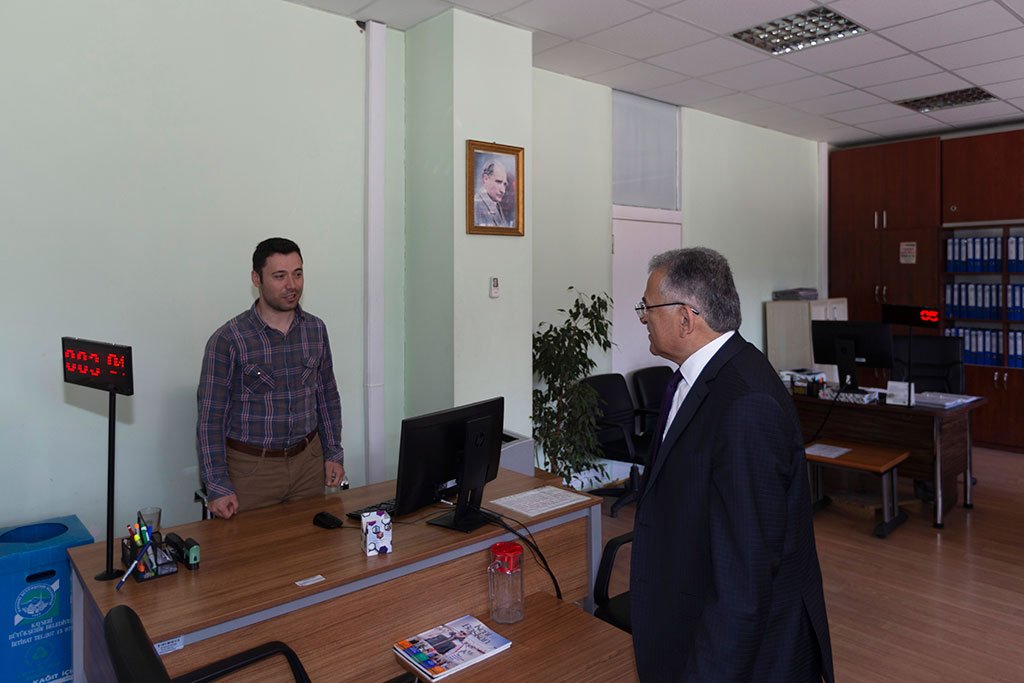 Kayseri Büyükşehir Belediye Başkanı Dr. Memduh Büyükkılıç, gece yarısı ayrıldığı belediye hizmet binasındaki 2’nci gününe sabahın erken saatlerinde birim ziyaretleri ile başladı. Alo 153 Çağrı Merkezi’nde de incelemelerde bulunan ve burada gelen bir çağrıya cevap veren Başkan Büyükkılıç’ı vatandaşın sesinden tanıması renkli görüntüler oluşturdu. Büyükşehir Belediye Başkanı Memduh Büyükkılıç slogan haline getirdiği ve tüm personele işaret ettiği “Durmak Yok, Koşmaya Devam” sözünün gereğini yerine getirmeye devam ediyor. Mazbatasını alıp görevine başladığı günün 3’ncü saatinde üst düzey yöneticilerle 6 saat süren bir toplantı yapan ve gece yarısı Büyükşehir Belediyesi Hizmet Binası’ndan ayrılan Başkan Büyükkılıç, Büyükşehir mesaisinin ikinci gününe sabahın erken saatlerinde birimleri ziyaret ederek başladı. Hizmet binası girişinde çevre düzenlemesi yapan personelin yanına giderek kolaylıklar dileyen Başkan Büyükkılıç, personele çay ikramında bulunduktan sonra zemin katta bulunan birimleri ayrı ayrı ziyaret ederek hem personelle tanıştı hem görev ve sorumlulukları ile ilgili tavsiyelerde bulunarak, “Vatandaşımız baş tacımızdır. Gönüllerde olacağız. Herkesle yakından ilgilenmeli, işleri hızlıca sonuçlandırmalıyız” dedi. Başkan Büyükkılıç ile vatandaş arasında Büyükşehir Belediye Başkanı Dr. Memduh Büyükkılıç mesaiye Büyükşehir Belediyesi içerisindeki birimleri tek tek gezerek başladı. Birim ziyaretleri kapsamında 153 Alo Çağrı Merkezi’ni de ziyaret edip incelemelerde bulunan Başkan Büyükkılıç, gelen bir çağrıya da bizzat kendisi cevap verdi. İl Sağlık Müdürlüğünün numarasını öğrenmek için 153 Çağrı Merkezi’ni arayan Semra Sülünhat adlı vatandaşın kısa bir süre sonra Başkan Memduh Büyükkılıç’ı sesinden tanıması üzerine ortaya çıkan sohbet renkli görüntüler oluşturdu. Başkan Büyükkılıç’a hayır duasında bulunan Semra Sülünhat ile görüşen Başkan Büyükkılıç, “Sabah sabah bu duaları almak için burada olmam lazımmış. Cenabı Allah inşallah rızasına uygun hizmetler yaptırır. Sizin gibi güzel insanlara da bizleri layık kılar” şeklinde konuştu.